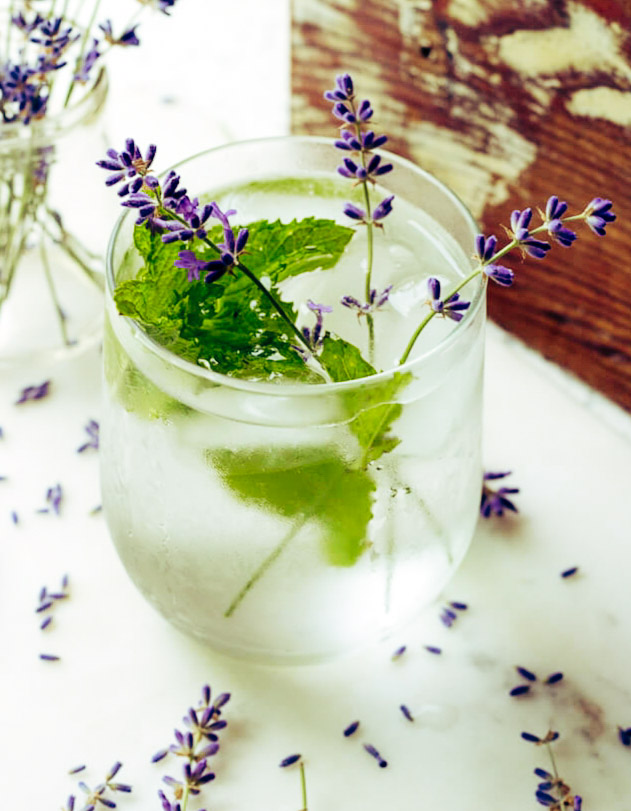 Enjoy infused spa water over ice with lavender and mint garnish